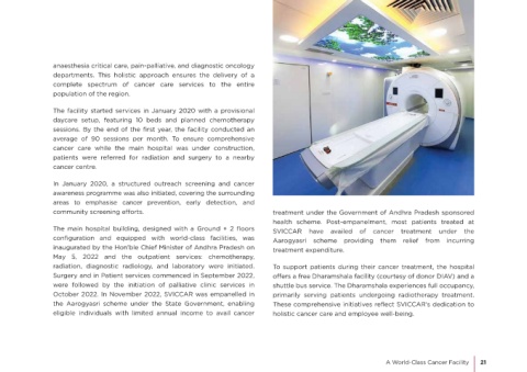 fully functional medical, radiation, and surgical oncology Surgery and in Patient services commenced in September 2022, o ers a free Dharamshala facility (courtesy of donor DIAV) and a